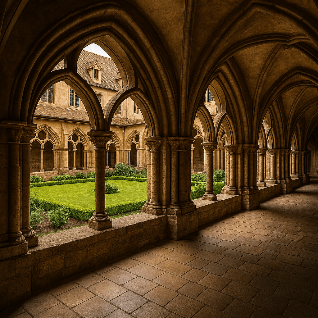 아치형 기둥이 반복되는 패턴 속에 인물을 세우면